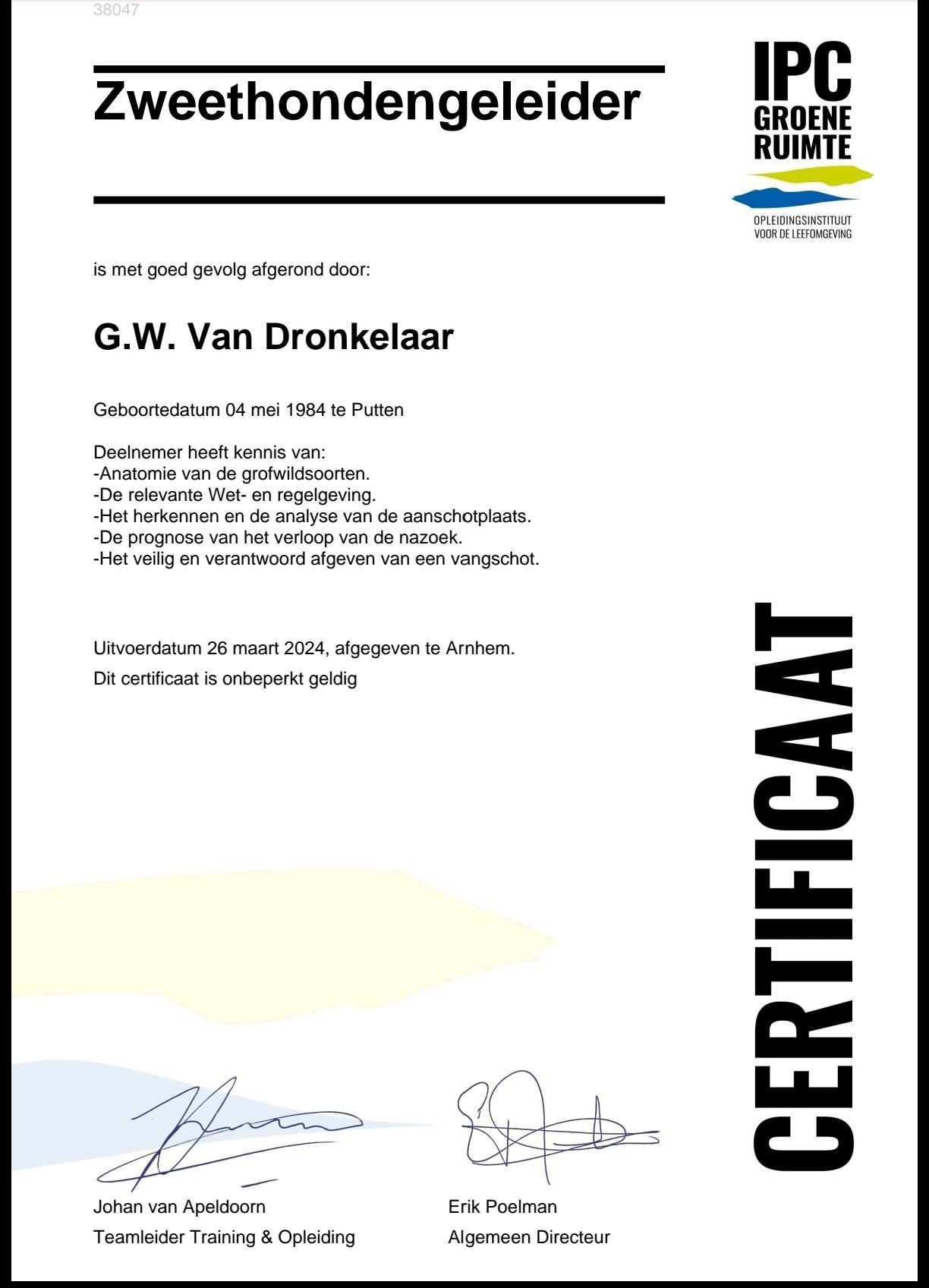 Zelf ben ik gekwalificeerd als zweethondengeleider behaald bij IPC groene ruimte